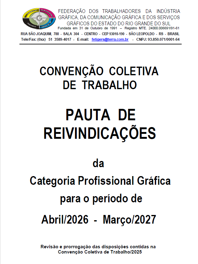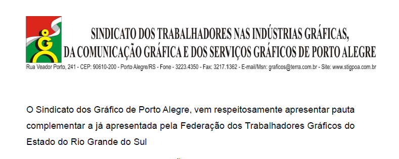 O Sindicato dos Gráfico de Porto Alegre, vem respeitosamente apresentar pautacomplementar a já apresentada pela Federação dos Trabalhadores Gráficos doEstado do Rio Grande do Sul