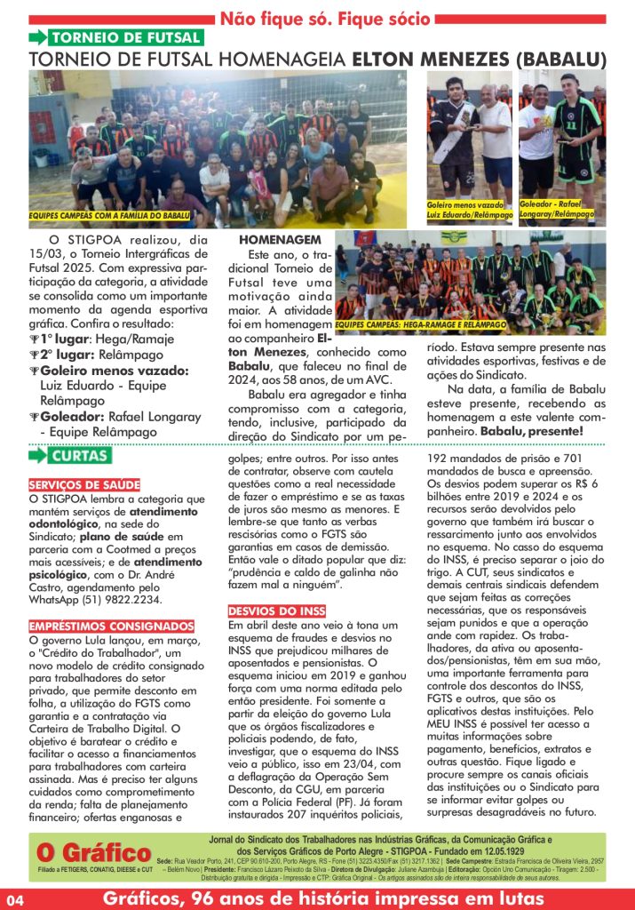 No dia 15 de março de 2025, o STIGPOA promoveu mais uma edição emocionante do Torneio Intergráficas de Futsal, reunindo trabalhadores, amigos e famílias em um momento de lazer, união e memória.